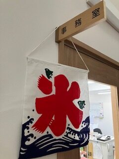 事務室入り口には、少しでも涼しい気持ちになるよう、氷旗を下げてみました。