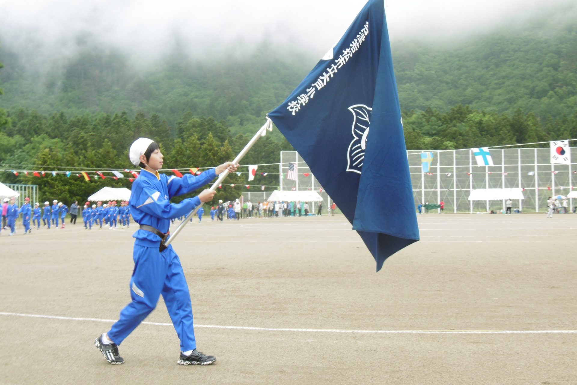 5月27日土曜日、少し肌寒い天気でしたが、小学校・地区合同運動会が開催されました。入場行進の旗手を務めました。