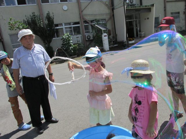 これもシャボン玉? 2025年4月25日2017年8月3日 会津も梅雨明けした2日、さわやかな暑さの中で、シャボン玉遊びをしました。いつもすてきなマジックを見せていただく渡部先生が来てくださいました。 と~っても大きなシャボン玉、へんてこなシャボン玉、たくさんのシャボン玉で遊びました。
