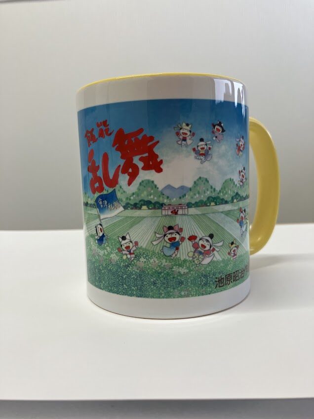 この度、記念のマグカップを頂戴しました。アニメ「まんが日本昔ばなし」の原作を書かれた、池原昭治先生の作品です。児童園の子どもたちのよさこいチームは「會津乱舞」(あいづらぶ)といいますが、左下の子どもが振っている旗がそれです。会津鉄道や磐梯山を遠くに見ながら、元気に踊っている素敵な作品ですね。