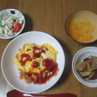 オムライスにはパンプキンや黒猫の顔を描き楽しみました!上手に描けた様でニコニコ笑顔に!